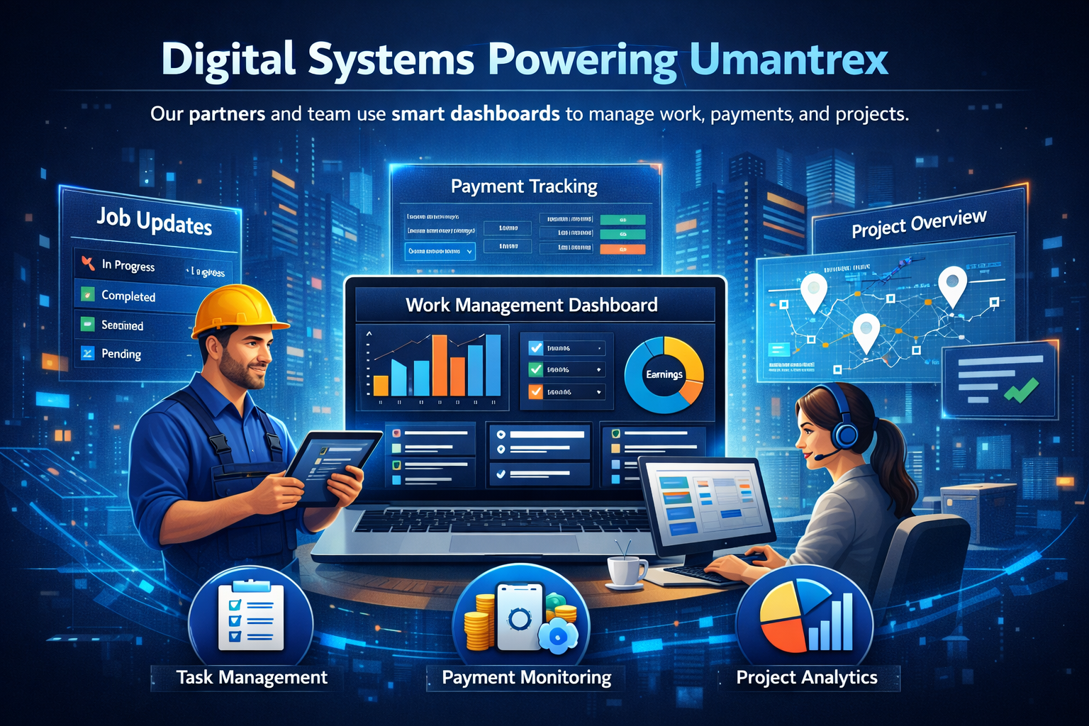 Umantrex uses its own intelligent backend system to manage partners, projects and customer support efficiently.